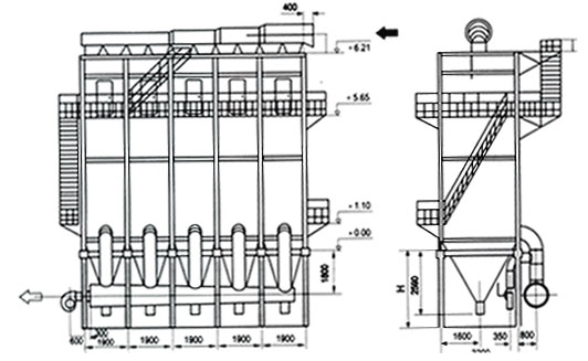 該設備由含塵氣體入口至凈化煙氣出口,本體結構由進氣管路、進氣室、袋室、灰斗、排灰閥、出口管道及反吹風系統(tǒng)和清灰控制系統(tǒng)所組成。