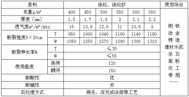 滌綸針刺過濾氈是制做常溫除塵布袋的理想材料,滌綸針刺氈采用中石化化生產(chǎn)的高標準滌綸纖維,按照國標GB12625-90標準生產(chǎn),加工制作的過濾材料,為常溫過濾材料的主要品種。滌綸又稱聚酯,無論在干、濕性狀態(tài)下變化不大。它對絕大部分常溫中的氛圍提供良好的抵抗力。適應(yīng)場合: