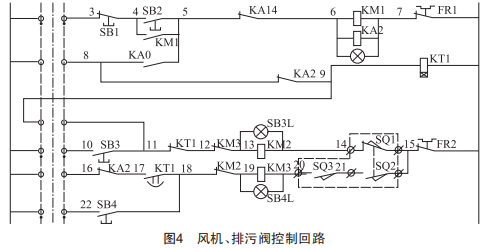 風機、排污閥控制回路如圖4所示,圖中3~22為接線端子編號,KA14為基本水位繼電器常閉節點,除塵器長時間處于停運狀態并且排污閥存在漏水現象,水箱內部大部分水流失。遠程啟動風機時,負壓對水箱水位造成波動,使基本水位信號消失,KA14斷開,風機停運聯鎖排污閥打開,同時進水電磁閥動作,KT1計時時間到后排污閥關閉。關閉到位,進水電磁閥保持進水,基本水位信號亮起,KA14閉合,風機啟動,造成基本水位信號消失。之后不斷循環以上步驟,浪費大量水源及影響設備正常運行,需要及時對排污閥漏水問題進行處理。