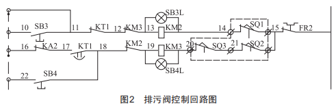 (2)回路元器件損壞。如圖2所示,按下sB4按鈕,限位正常,關排污閥無反應,需要查看熱偶FR2是否動作,或查看接觸器KM3是否缺相及節點損壞。熱偶動作需要復位,并檢查閥桿是否卡澀及超過行程,結合實際問題進行處理。